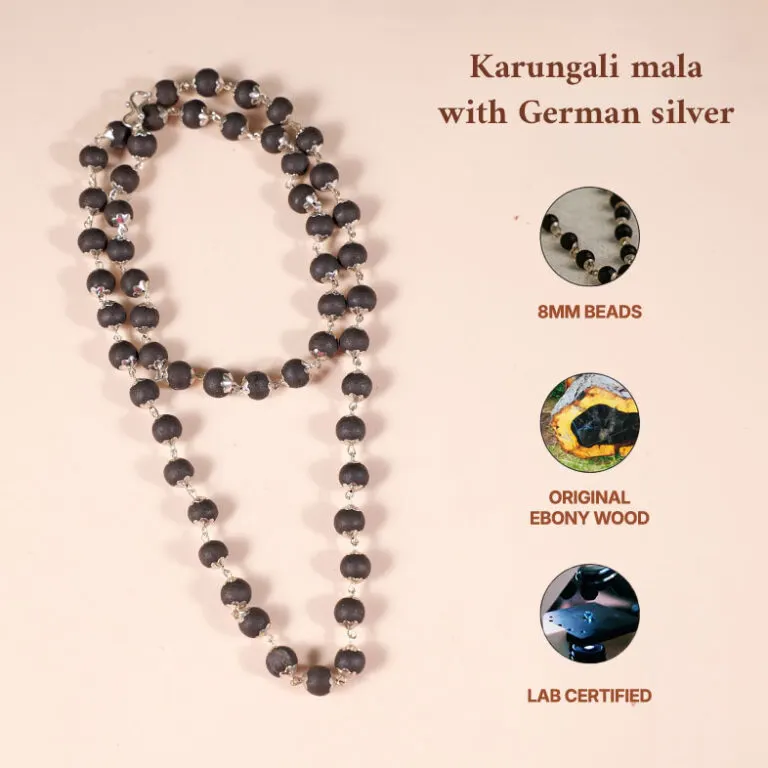 Crafted from pure, unpolished Black Ebony Wood (Karungali) and finished with silver caps, this sacred Karungali Mala is designed to elevate both your spiritual practice and personal style.