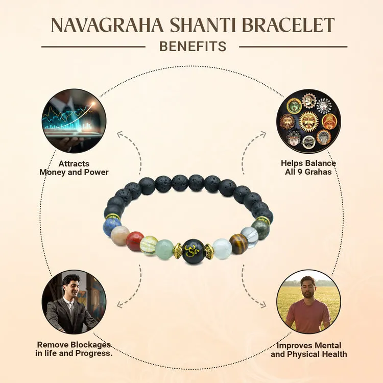 Restore balance, attract abundance, and harmonize planetary energies with the Navgraha Shanti Bracelet, thoughtfully curated by Spiritual Aura. This powerful bracelet combines the energies of nine sacred gemstones, each representing one of the Navgrahas, along with grounding lava beads and a sacred Om bead for inner peace and stability.